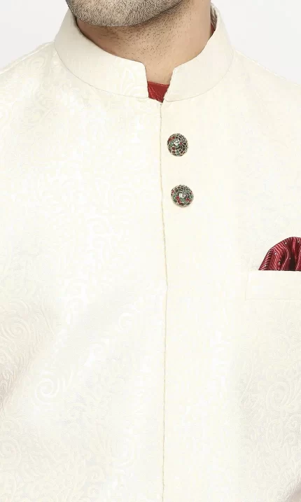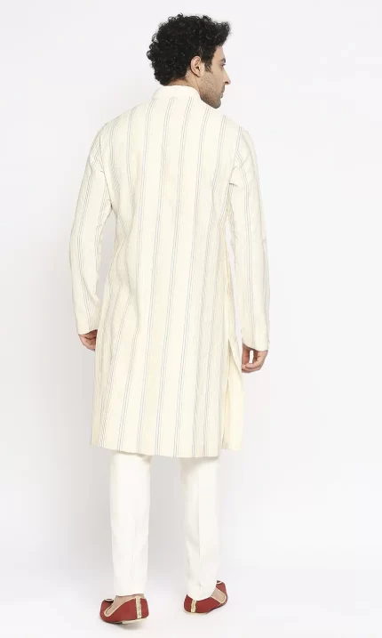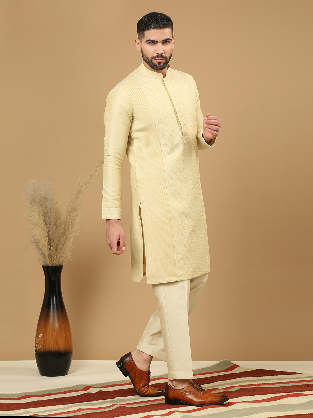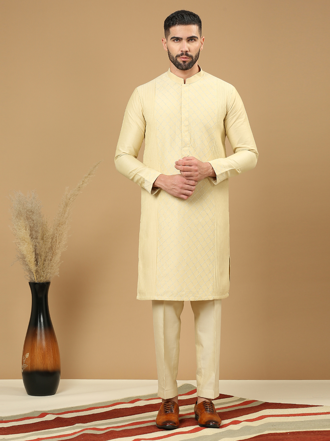 Beige kurta features intricate diamond threadwork & pintuck panels, paired with aligarhi pants.