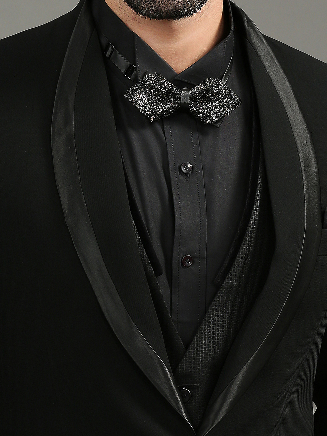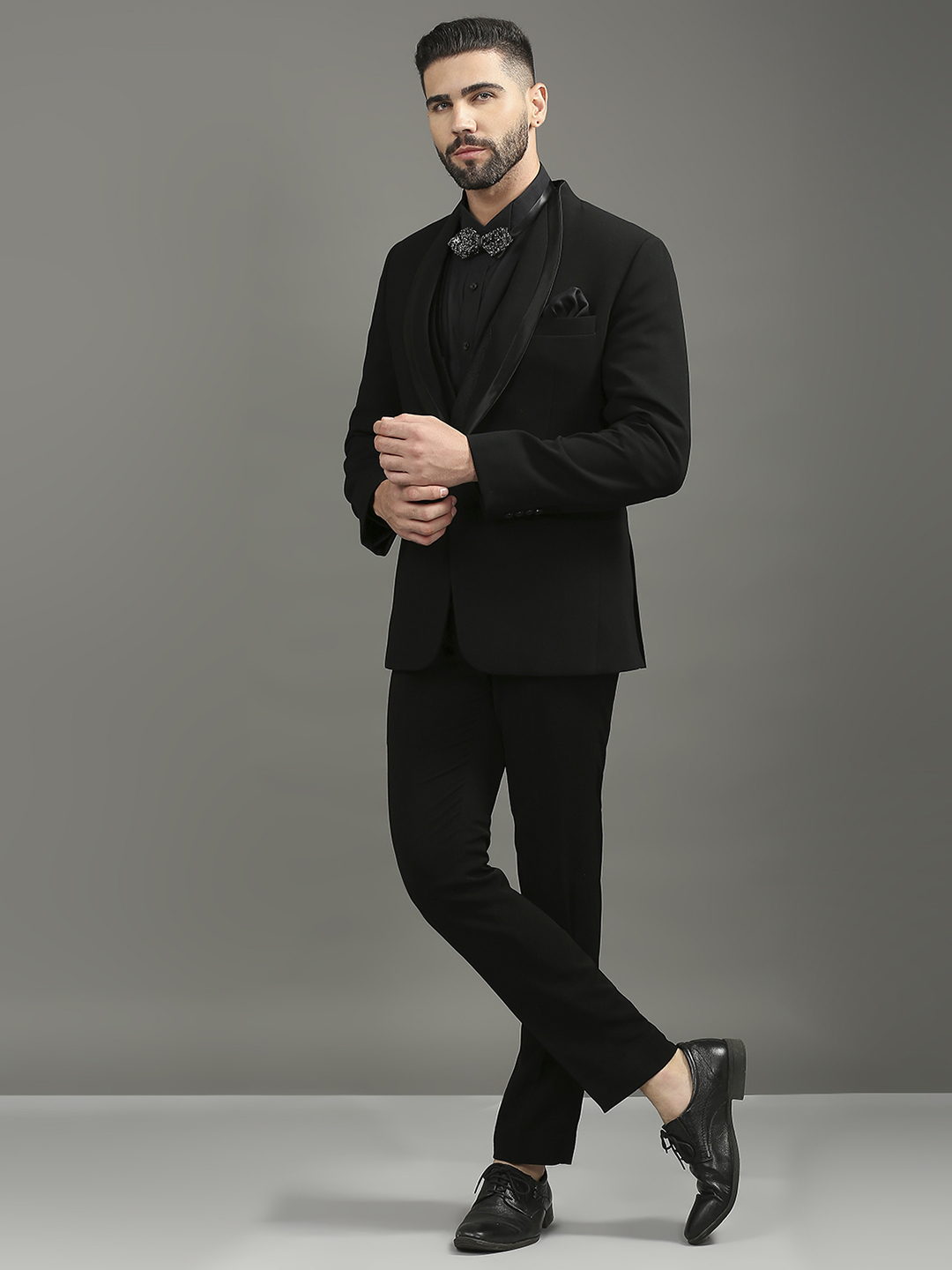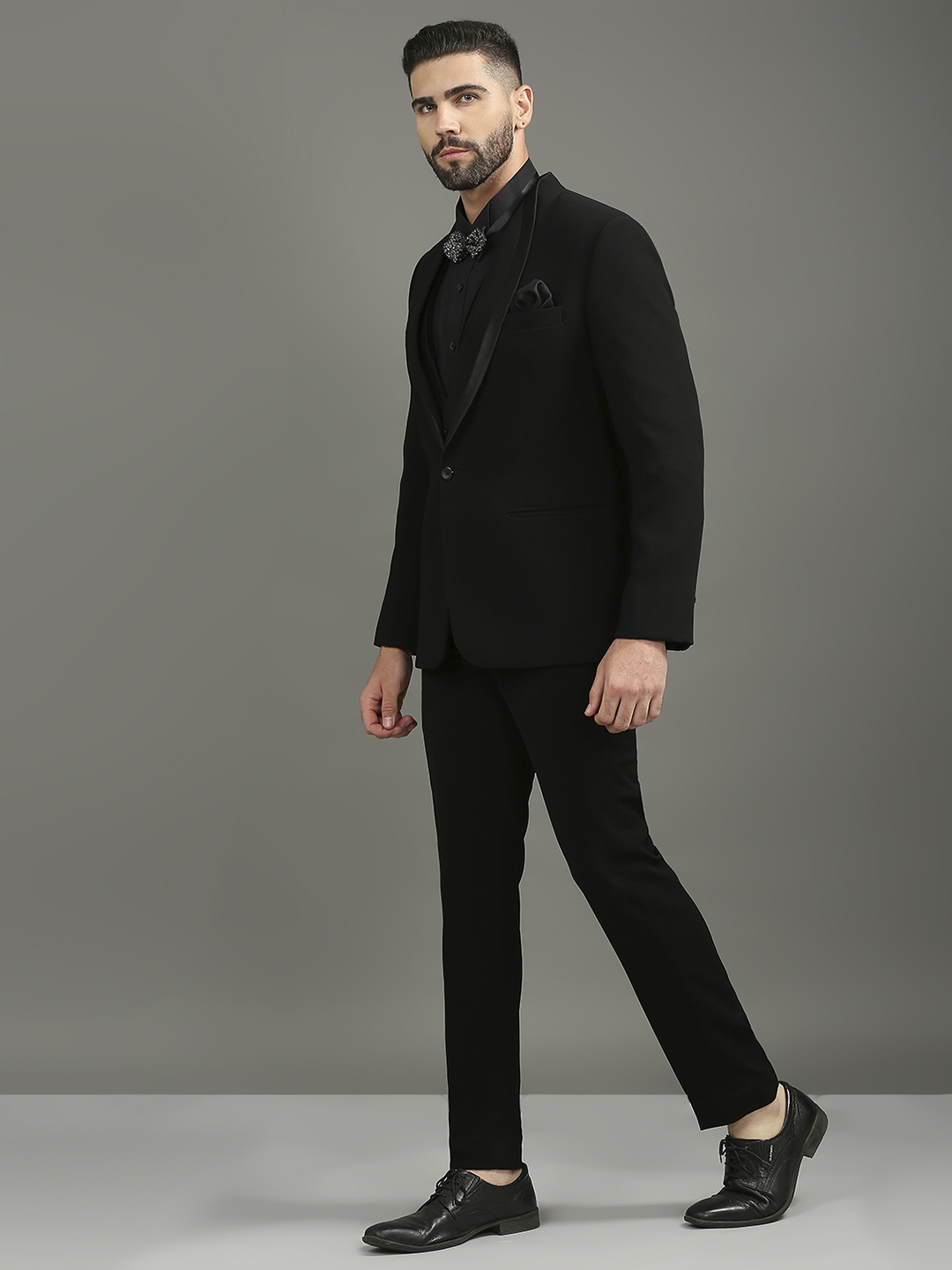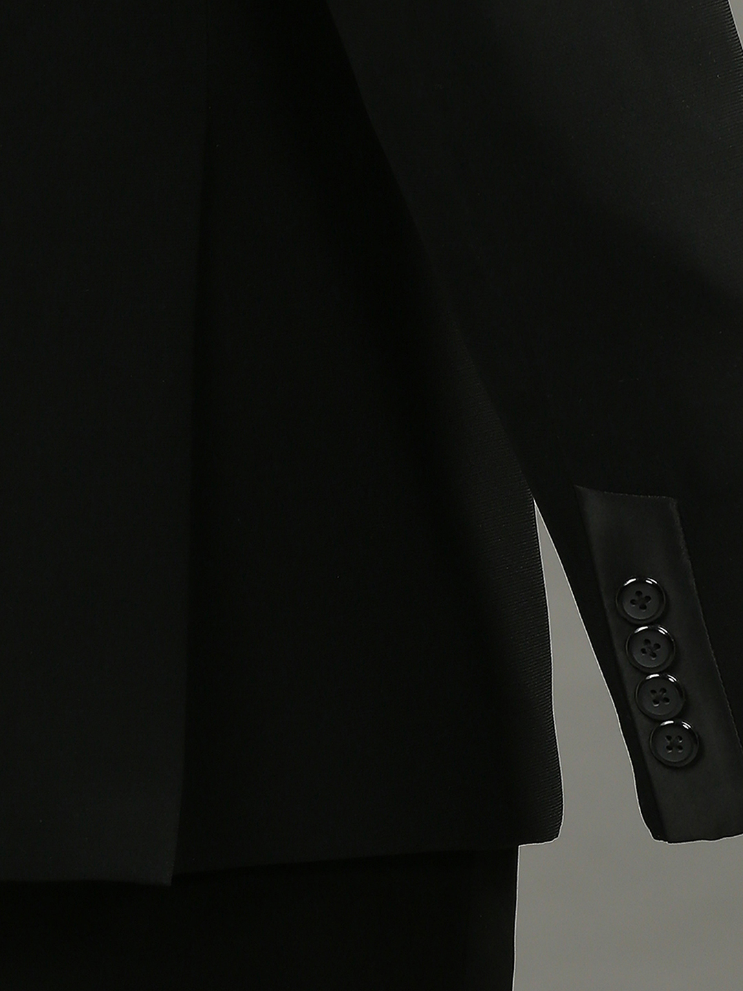 Black tuxedo with an oval-shaped lapel and satin detailing, paired with matching black pants.