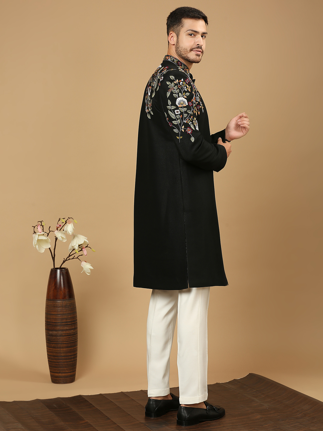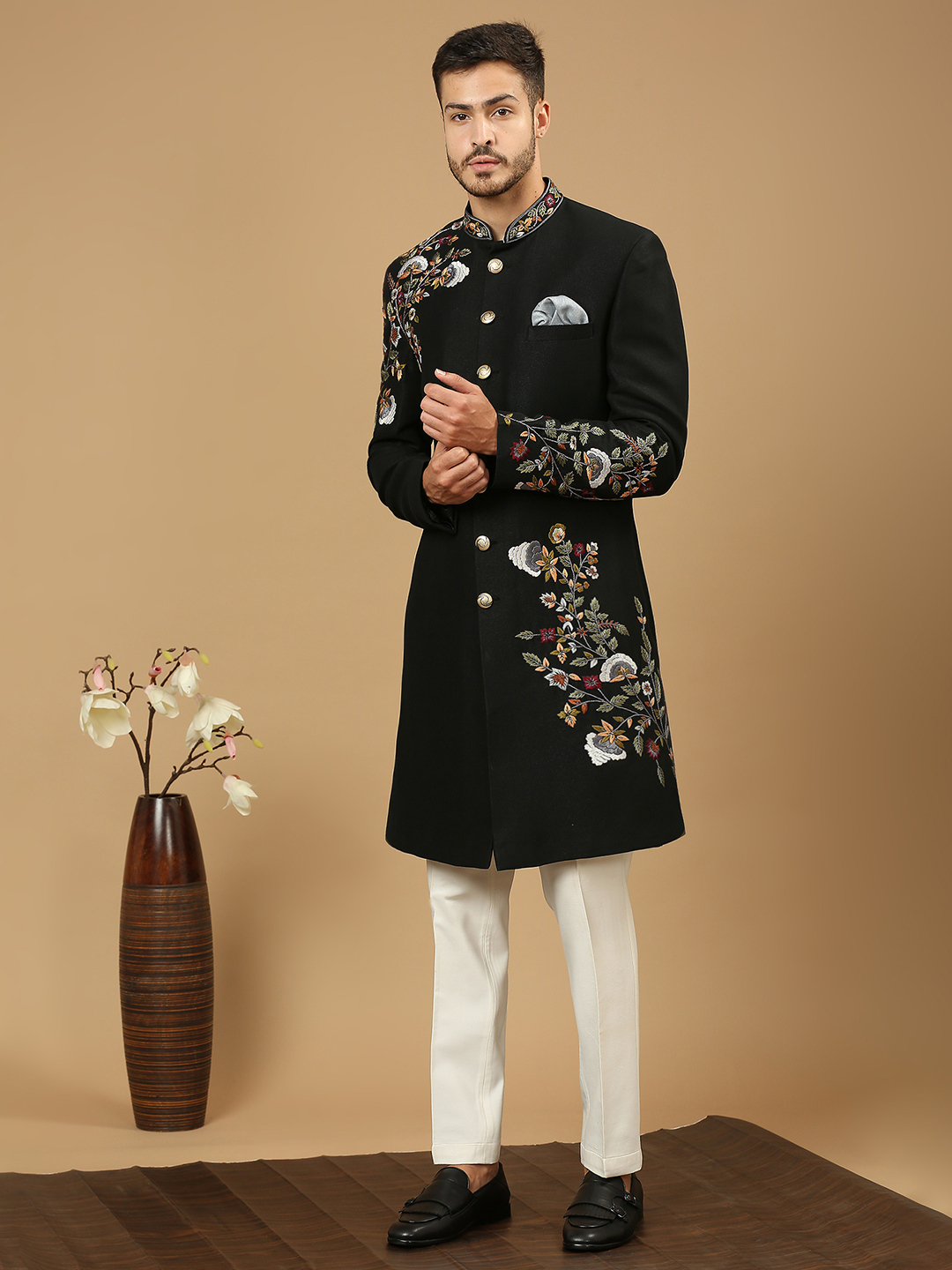 Black pal-zeleri sherwani features exquisite floral embroidery & grey detailing, paired with aligarhi pants.