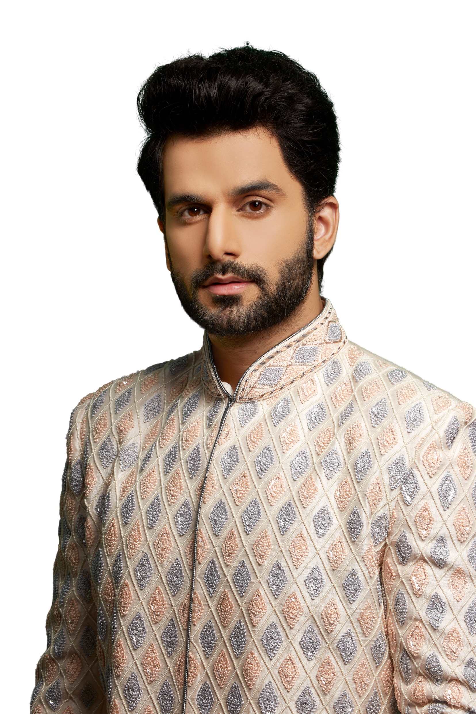 Experience luxury fashion with DMODE’s stunning blush pink sherwani set, featuring dazzling dismante sequential embroidery and intricate French knots. Complete with an elegant ivory churidar, this ensemble is a true masterpiece.