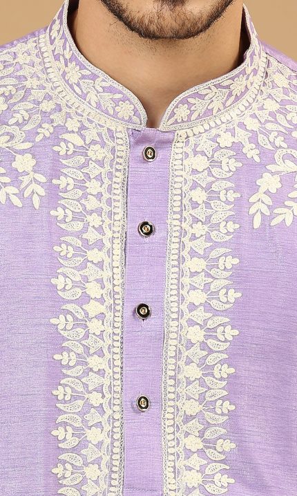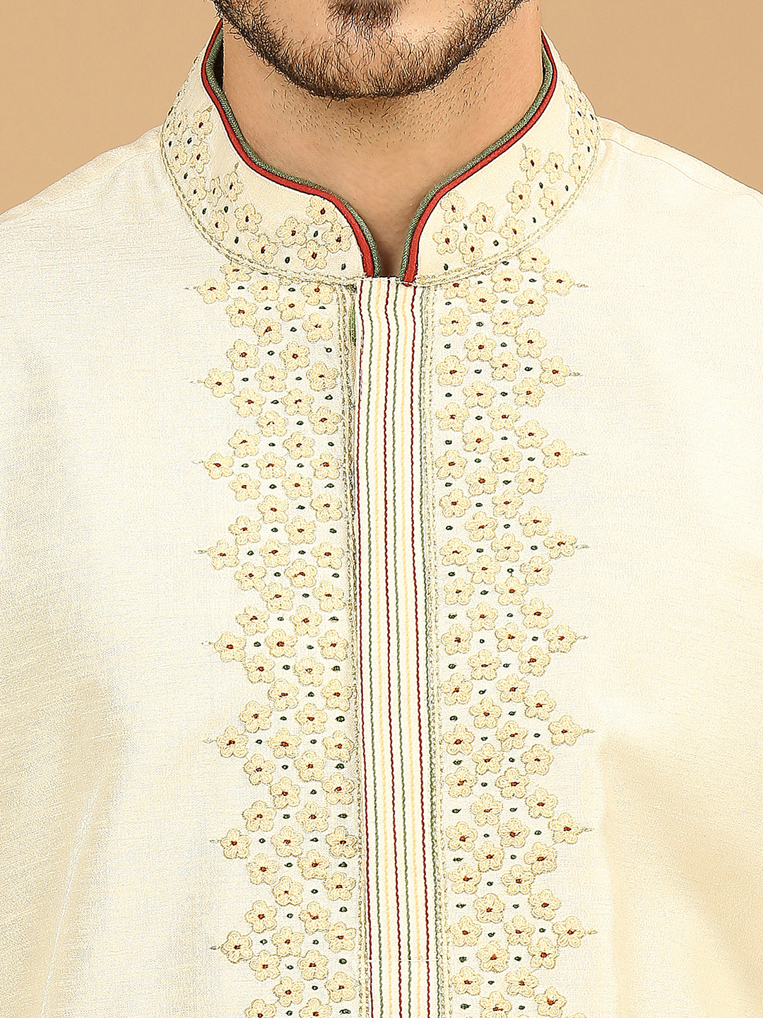 Cream kurta with vibrant threadwork, paired with off-white aligarhi pants.