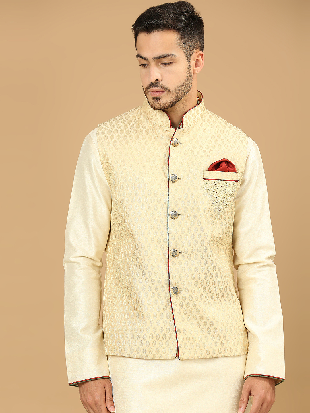 Gold brocade jacket with a cream kurta featuring floral embroidery, paired with off-white aligarhi pants.