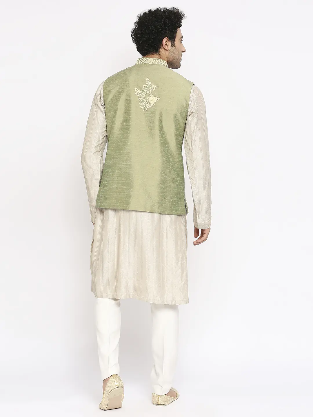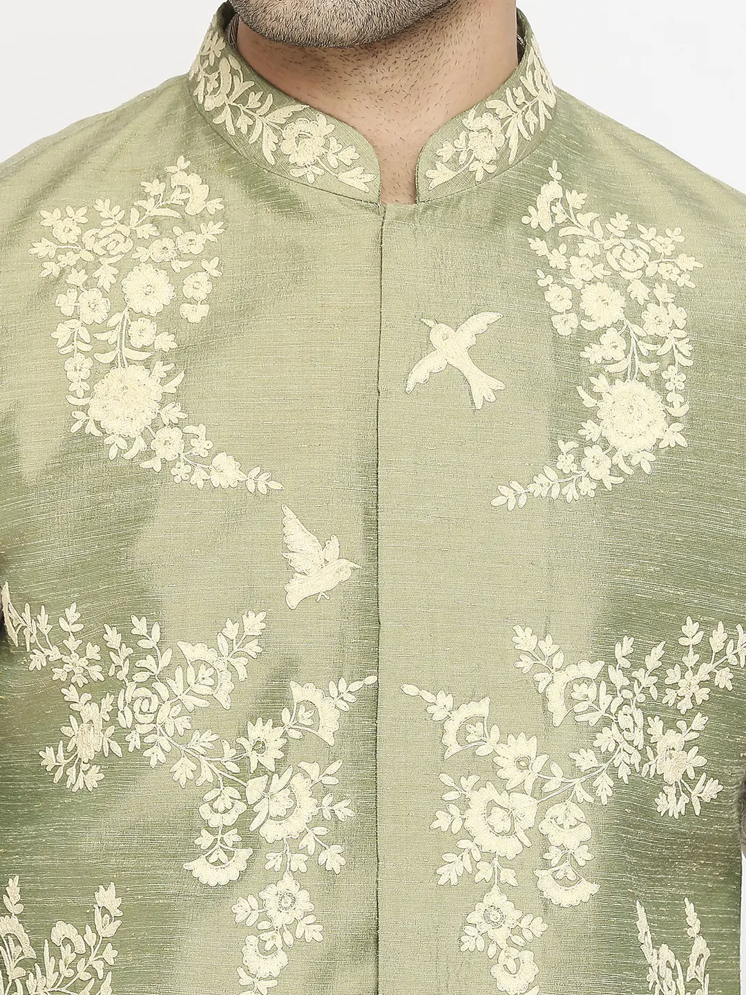 Traditional elegance meets contemporary flair in this harmonious ensemble. The Sage Green jacket features off-white floral embroidery for sophistication, while the cement colored pintuck kurta adds subtle charm and grace.