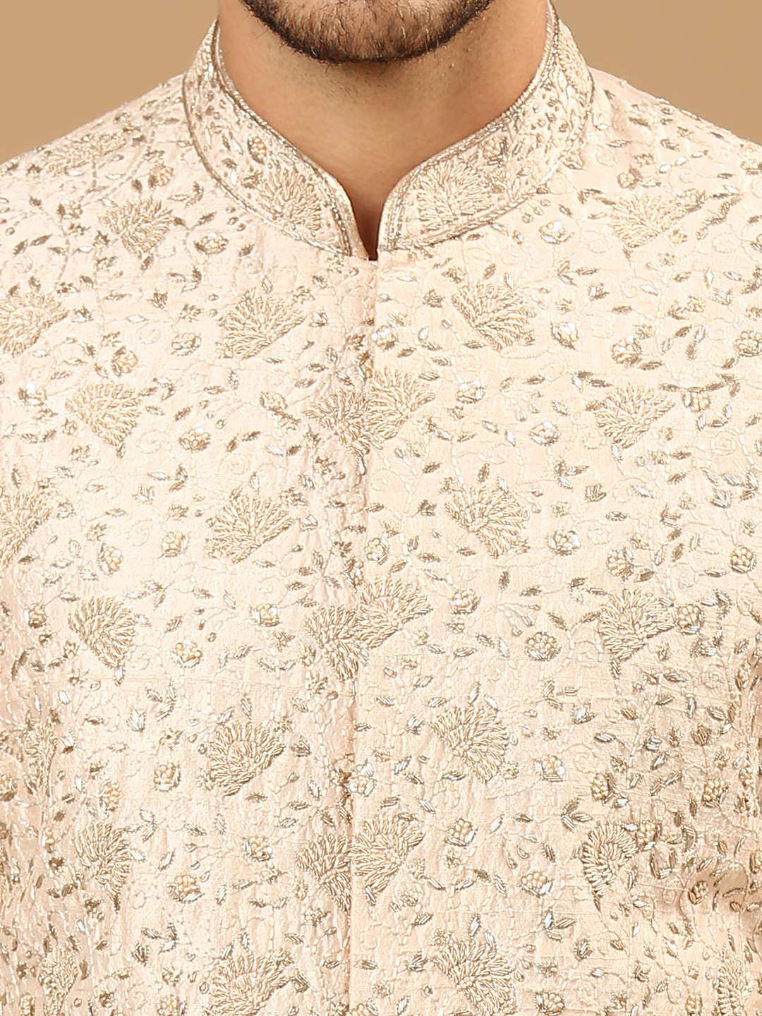 Light pink sherwani features all-over hand embroidery & rose gold accents, paired with aligarhi pants.