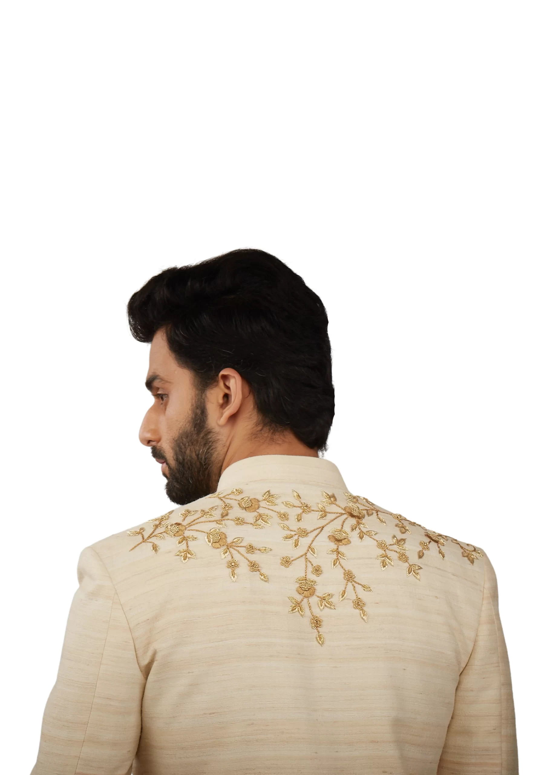 Attain a contemporary and subtle appearance with the cream sherwani, adorned with intricate gold embroidery, and paired with a champagne cowl dhoti for a simplistic yet elegant ensemble.