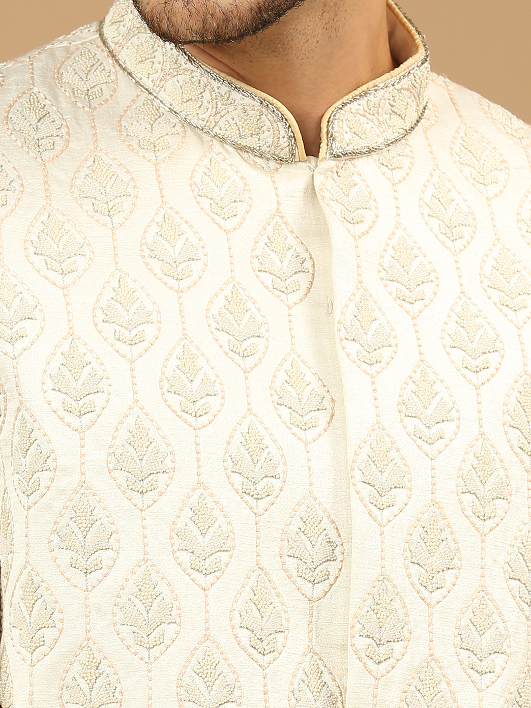 Off-white sherwani featuring a peach pattern with intricate bead & french knot detailing, paired with aligarhi pants.