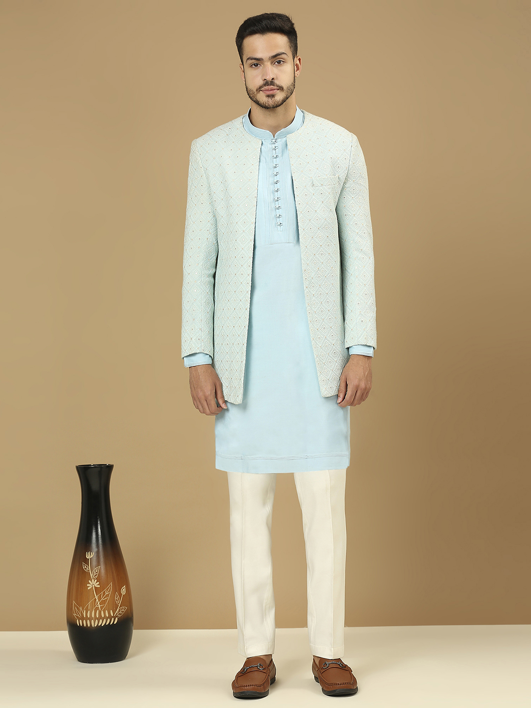 Sky blue set with an open jacket featuring intricate lucknowi hand-embroidery, paired with a stylish kurta & aligarhi pants.